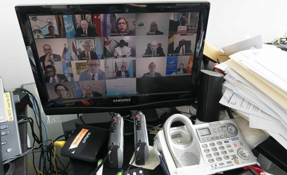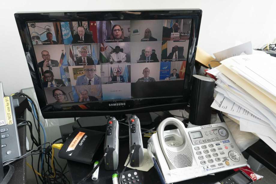 United Nations Secretary-General Antonio Guterres, second from right bottom, seen on a computer monitor at United Nations headquarters participates in a virtual high-level meeting of the Security Council meeting on safeguarding international peace and security and global governance in the post-COVID-19 era, happening during the 75th session of the United Nations General Assembly, Thursday, Sept. 24, 2020. less United Nations Secretary-General Antonio Guterres, second from right bottom, seen on a computer monitor at United Nations headquarters participates in a virtual high-level meeting of the Security Council … more