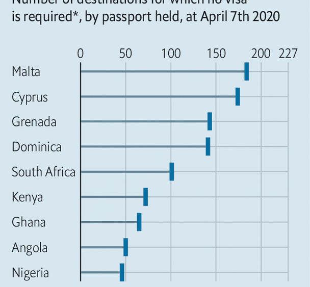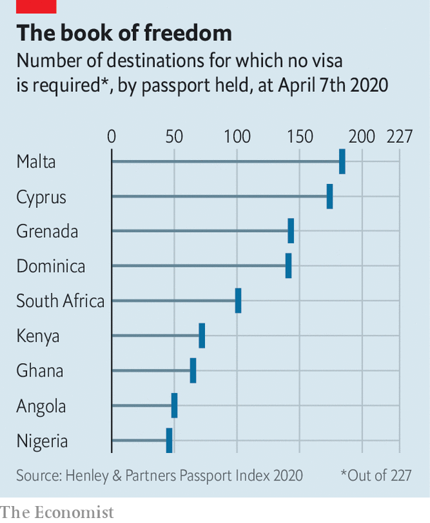 More and more rich Africans are buying second passports or foreign residency rights. They do so because their own passports open few doors (see chart). Henley and Partners, which advises people on how to acquire a spare nationality, says inquiries from Africa are up by a third compared with last year. The firm is opening an office in Lagos, adding to those in Johannesburg and Cape Town. Habila Malgwi of Arton Capital, another adviser, says it has agents in 15 African countries and plans to open an office on the continent “very, very soon”. Covid-19 has led to soaring interest. People, he says, are looking for a Plan B.